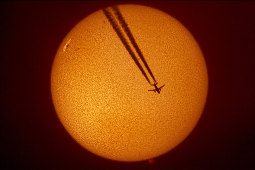 А на Астронете http://www.astronet.ru/db/msg/1166085 есть такое же фото 2001 года: И очень хороший текст: Пояснение: Кто хочет - тот дождется ... самолета. Однажды опытный фотограф Солнца Тьерри Лего, находясь у себя дома в одном из пригородов Парижа, обратил внимание на самолеты, пролетающие на фоне Солнца. Ему тут же пришла в голову идея этой фотографии, но пришлось пережить не одну неудачную попытку, пока, наконец, около двух недель удалось застичь реактивный лайнер MD-11 в момент пересечения солнечного диска при настроенном фотографическом оборудовании. Приведенный здесь снимок был получен в особом цвете в красной части спектра -- так называемой водородной линии H-альфа -- с цифровым усилением контраста. Бурная поверхность Солнца покрыта кружевом темных протуберанцев. То, что это фотошоп, ясно всё по тому же угловому размеру - самолет должен быть в половину солнца. А вот и ключевая фраза: опытный фотограф Солнца Т.е., как я говорил еще два года назад, бодаясь с Мюллером/лягушкой по поводу фото МКС на фоне Солнца, такие снимки делают специально ангажированные фотографы: у них супертехника и финансы для поездок по всему миру. И это еще одно подтверждение, что фальсификации были всегда, а не только сейчас.